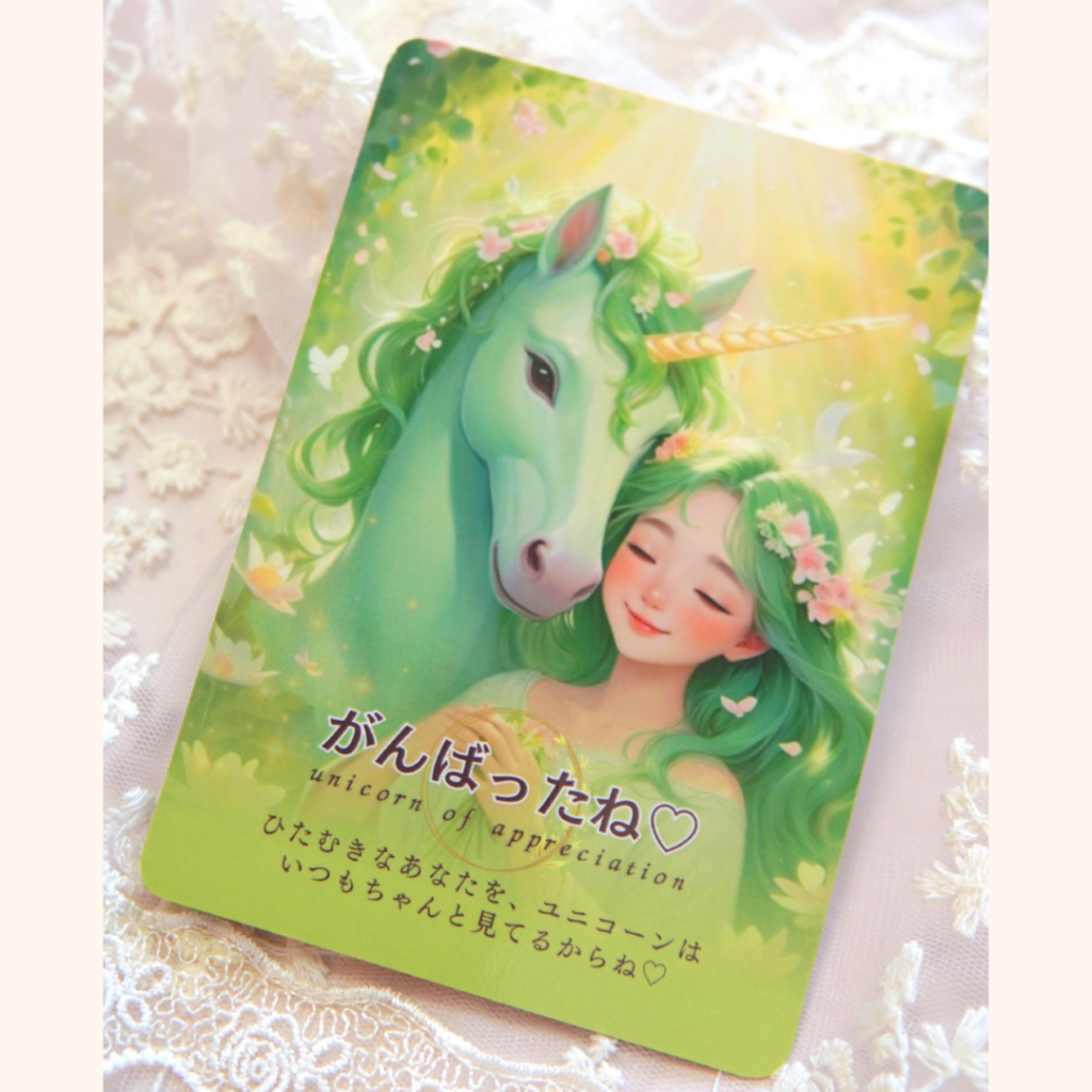 カードの裏面は、ユニコーンの聖なる光の森をワクワク歩いているデザイン🌸